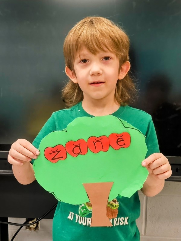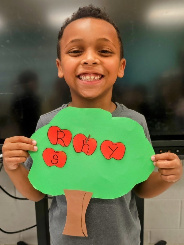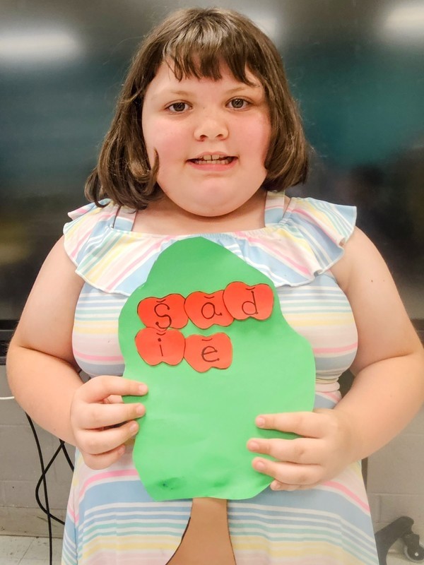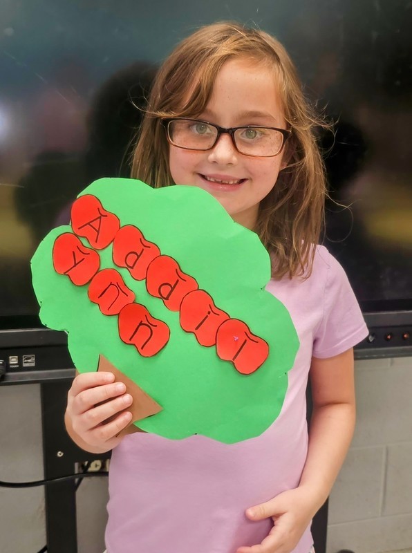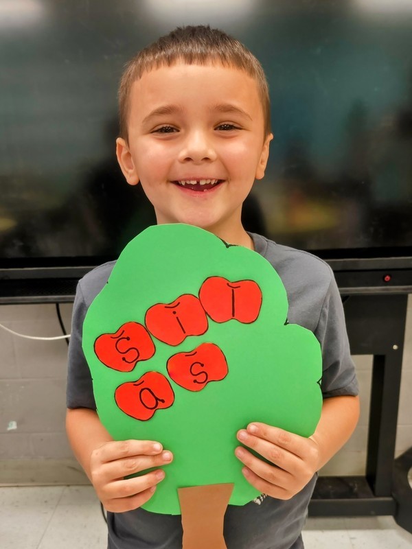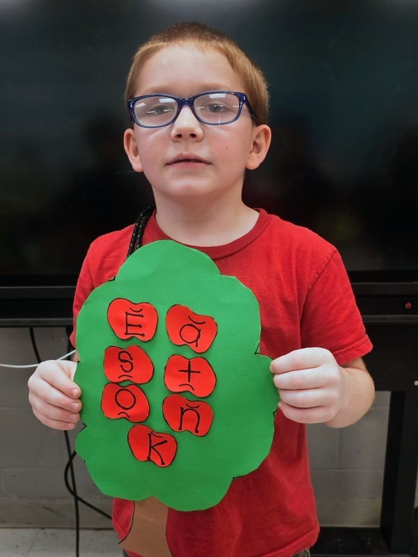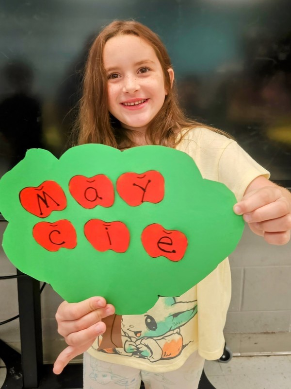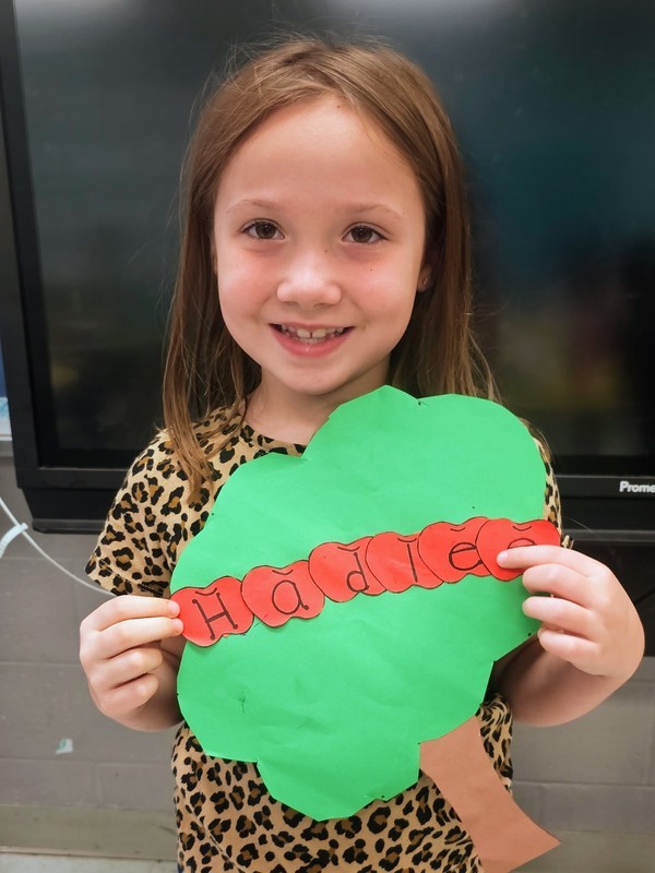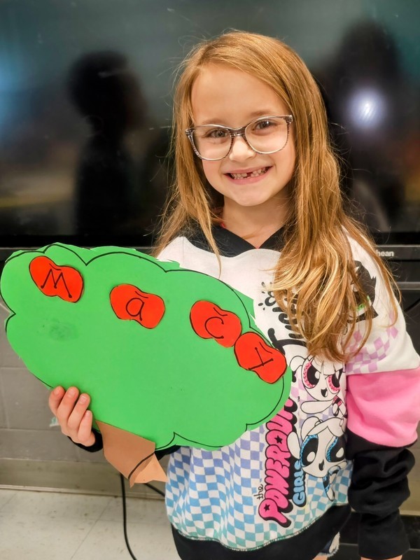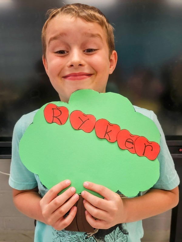 Students in Mrs. Stepp's first grade studied the legend of Johnny Appleseed then made their own name Apple Tree.